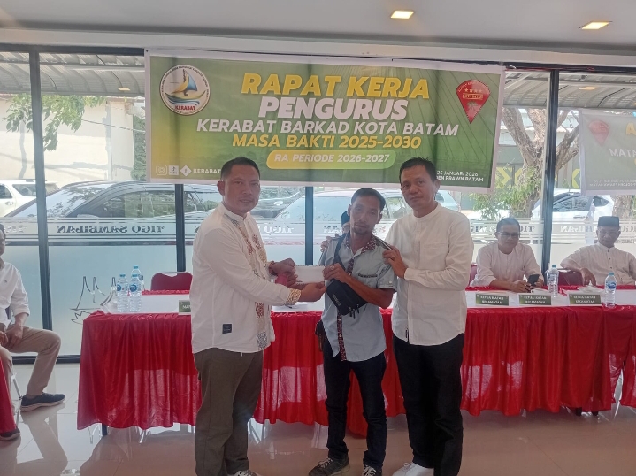 Penyerahan santunan dilakukan secara simbolis di sela-sela Rapat Kerja (Raker) Pengurus KERABAT–BARKAD, yang berlangsung di ruang VIP Rumah Makan Tigo Sambilan, Bengkong, Minggu (25/8/2026).