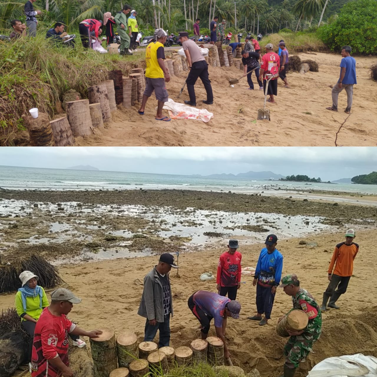 Setelah menerima laporan, Tim Reaksi Cepat (TRC) BPBD Jemaja bersama Babinsa, Babinkamtibmas, staf desa, RT, RW, dan masyarakat setempat segera bergerak ke lokasi. Mereka bahu-membahu melakukan perbaikan dan penimbunan jalan yang rusak. Proses perbaikan dilakukan secara gotong royong dengan menyusun batang kelapa, batu, dan tanah untuk menutup bagian jalan yang longsor akibat hujan deras dan terjangan ombak.