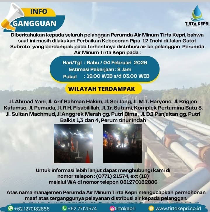 Manajemen Perumda Air Minum Tirta Kepri menyampaikan bahwa perbaikan baru dapat dilakukan pada Rabu (5/2/2026), sehingga selama proses perbaikan berlangsung distribusi air ke pelanggan terdampak tidak dapat berjalan normal.