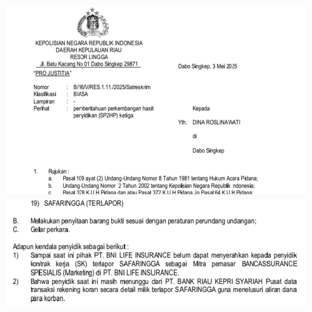LINGGA (Sempadanpos.com)– Kepolisian Resor (Polres) Lingga kini resmi menaikkan status kasus dugaan investasi bodong yang menyeret Kantor Cabang Pembantu (KCP) BNI Life di Dabo Singkep, Kepulauan Riau, ke tahap penyidikan. Dengan nilai kerugian mencapai Rp8 miliar, kasus ini menjadi sorotan tajam publik karena diduga melibatkan lebih dari satu pelaku.