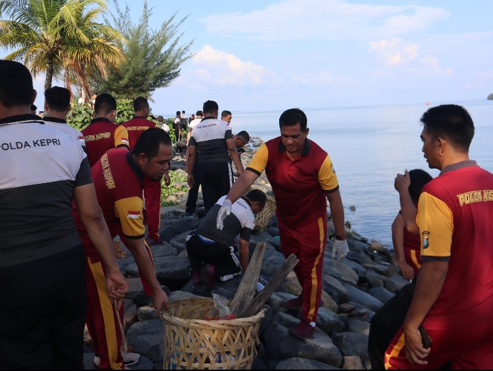 Kegiatan ini melibatkan personel Polresta Tanjungpinang yang turun langsung membersihkan area pesisir di sekitar Tugu Sirih, ikon kota yang menjadi salah satu lokasi strategis dan ramai dikunjungi masyarakat.